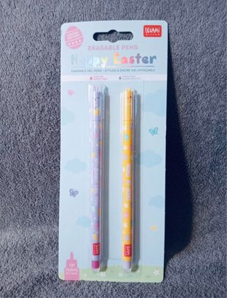 Set di due penne gel cancellabili di Legami a tema pasquale. Design Happy Easter. Inchiostro viola e giallo. Punta da 0,7 mm.