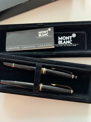 Elegante astuccio con due penne Montblanc. Colore nero. Dettagli dorati. Include scatola originale e documentazione. Pulite. SOLO DISPONIBILE MODELLO 146. Serigrafata.