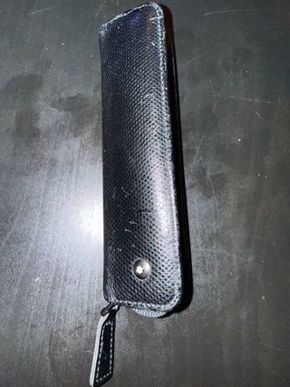 Custodia originale Montblanc, progettata per riporre penne. - Materiale: pelle testurizzata. - Colore: nero con dettagli rossi. - Chiusura: cinturino con bottone automatico. - Capacità: due penne. nuovo 150€