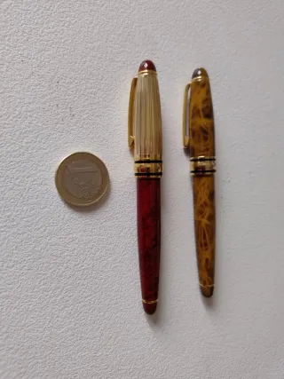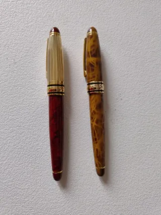 Set di due penne da collezione con un design elegante. ATTENZIONE sono di piccole dimensioni, per donna o mani piccole. - Una penna di colore rosso con dettagli dorati e cappuccio scanalato. - Un'altra penna con un motivo marmorizzato in tonalità marroni e dorate. sailor Parker pelikan inoxcrom papermate lamy Cross aurora montblanc Conway waterman kaweco sheaffer conklin tombow Faber Castell montegrappa dupont TWSBI visconti namiki pilot platinum delta caran estilográfica estilografica rotring platinum delta