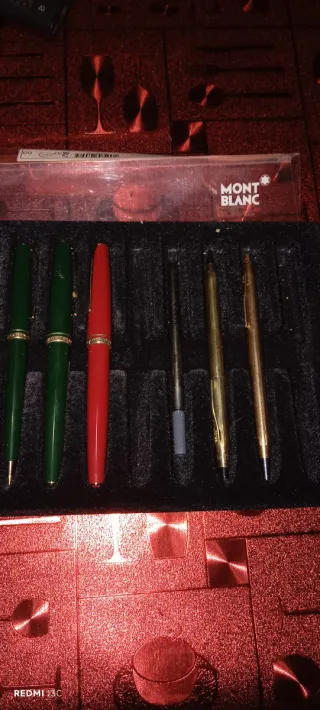 Set di penne Montblanc. Include due penne verdi, una penna rossa e due penne dorate. Include un ricambio di inchiostro.