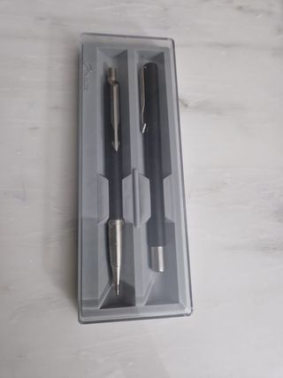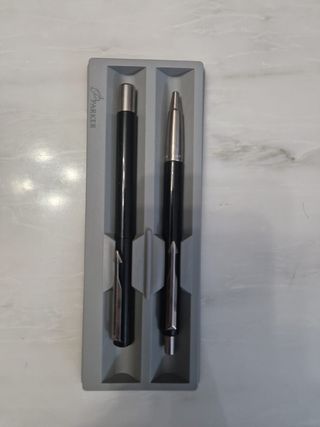 Set di due penne della rinomata marca Parker, prodotte negli Stati Uniti. Un classico per scrivere con stile. Nell'astuccio, una penna è nera, l'altra è blu molto scuro. Sono a prezzo ridotto da 60 a 40 euro. Design elegante in nero con dettagli argentati. Clip iconico di Parker. Nell'astuccio Parker.