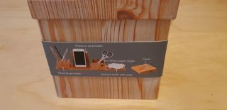 Fold-Out Stationery Box Kikkerland Una scatola multifunzione di legno stampato con venature per organizzare la vostra scrivania e richiudibile in formato da viaggio. Contiene un porta matite/penne, un porta cellulare/carte/bigliettini da visita, un porta forbici/colla/gomme ecc. e uno scomparto per foglietti per appunti. Vedere le foto per chiarimenti. È nuovo.