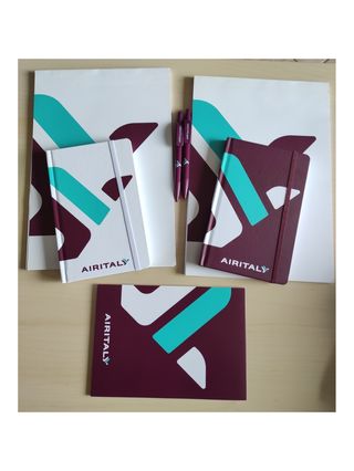 Set per scrittura, composto da 2 penne, 2 block notes grandi, 1 block notes piccolo, 2 agende rigide. Tutto nuovo, tranne 1 block notes grande che ha qualche foglio in meno. #airitaly #air #italy #set