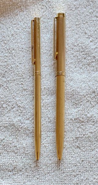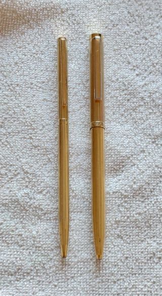 Penne a sfera anni Sessanta con placcatura oro millerighe, senza scatola. In discrete condizioni: in qualche punto la doratura è un po' rovinata, ma non ci sono ammaccature. Hanno i refill originali, ma sono secchi.