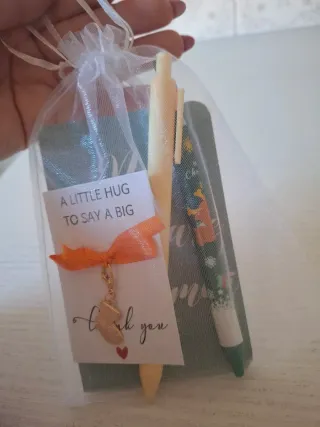 Grazioso set regalo per la cancelleria, perfetto per appunti o per fare un pensiero. - Include un notebook. - Due penne, una chiara e una decorata. - Un sacchetto regalo in organza bianco. - Un biglietto A little hug to say a big thank you con un ciondolo a forma di scarpa e un piccolo cuore rosso.
