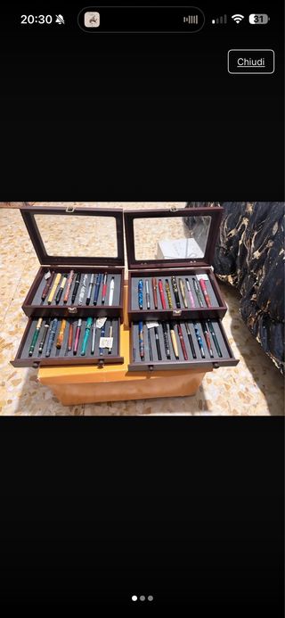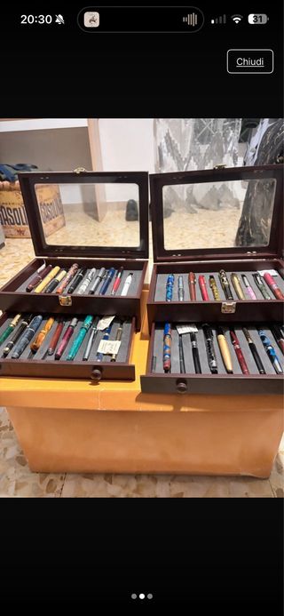 Set di confezioni per penne stilografiche. - Due scatole in legno scuro con coperchio trasparente. - Ogni scatola contiene due vassoi estraibili. - Ogni vassoio è foderato in velluto grigio. - Ogni vassoio ha alloggiamenti per le penne.