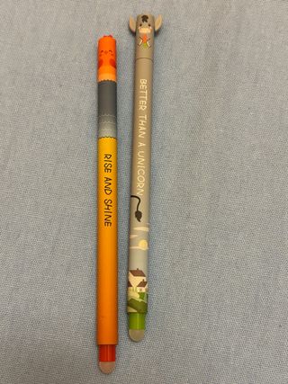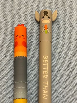 Set di due penne con simpatici disegni a tema fattoria. - Una penna rappresenta un asino e ha la scritta BETTER THAN A UNICORN. - L'altra penna rappresenta un gallo e ha la scritta RISE AND SHINE. Le penne somigliano ma NON SONO LEGAMI.