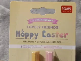 Set di 2 penne gel Legami a tema Pasqua, edizione limitata. - Design Hoppy Easter con coniglietti e decorazioni a tema. - Una penna EGGS-TRA HAPPY! con fantasia a quadretti viola e fiori. - Una penna HOPPY VIBES ONLY con fantasia a quadretti gialli e carote. - Inchiostro gel metallizzato viola e rosa. - Punta da 0.5 mm.