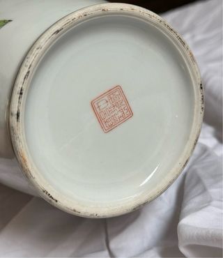 Elegante vaso antico in porcellana, realizzato in Francia. - Decorato con fiori rosa e foglie verdi. - Dettagli dorati sul bordo superiore e inferiore. - Base con finitura verde pastello.