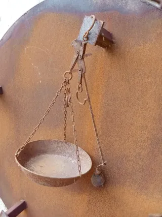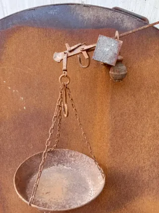 Antica bilancia stadera in metallo, con un design rustico e affascinante. - Struttura in metallo arrugginito. - Vaschetta per pesare. - Catene per sospensione.