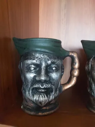 Coppia boccale da birra da collezione con un volto maschile scolpito. Il cappello è di colore verde scuro e il corpo del boccale è argentato con dettagli color bronzo. In ceramica. Ho acquistato a Londra anni 90. Misura della bocca 9x12.5, altezza 18.5. Ciascuno €30. - Design unico a forma di volto. - Dettagli in rilievo.