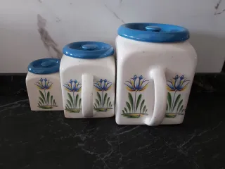 un set di barattoli/contenitori in ceramica della Bristol Pottery con motivo Old Bristol Delft Tulip. Presentano un motivo floreale dipinto a mano con tulipani. I coperchi sono di un blu brillante a contrasto. Il set è composto da tre barattoli di diverse dimensioni. Ideali in cucina per caffe, farina, zucchero, sale, ecc.. Sono considerati oggetti da collezione vintage. €54