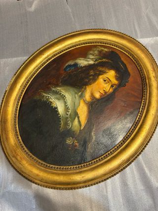 Elegante dipinto antico olio su rame, databile alla seconda metà del XIX secolo (circa 1870-1900). Raffigura un ritratto femminile di ottima qualita pittorica, firmato Campsales F.M. (firma leggibile in basso). Il rame come supporto è caratteristico delle opere di pregio, per via della superficie perfettamente liscia e della lunga conservazione. L'opera presenta una patina antica originale e un craquelure naturale tipico dell'olio su metallo. Nessuna rottura. La cornice ovale in legno dorato, coeva, è inclusa e aggiunge valore decorativo. Dimensioni Cornice: 61 × 50 cm Dipinto (rame): circa 45 x 35 cm