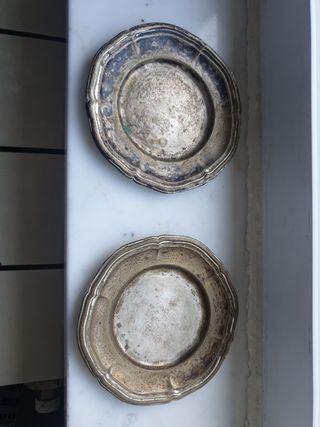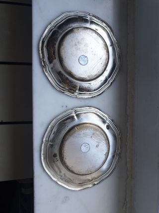 Set di due piattini in metallo argentato, con un design decorativo sul bordo. - Materiale: metallo argentato - Quantità: 2 pezzi