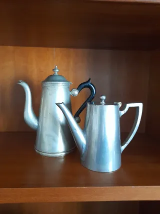 Set di due caffettiere antiche, realizzate in alpacca e peltro. 1 caffettiera è in stile vittoriano con manico in bachelite ed è in alpacca. Altezza cm 23 L'oggetto risale ai primi del '900 1 caffettiera è più moderna, risale agli anni '50 ed è in peltro. Altezza 16 cm Il prezzo si riferisce al set di 2 pezzi! - Design classico ed elegante. - Materiali di pregio.