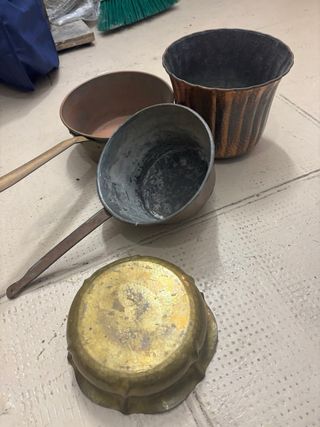 Set di quattro pezzi in rame e ottone, ideali per la cucina o come elementi decorativi. - Portavaso in ottone - N 2 Pentolino in rame con manico lungo. - Ciotola in ottone