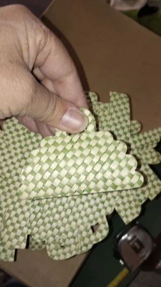 Set di scatoline per bomboniere realizzate in paglia intrecciata. - Design a forma di fiore con bordo smerlato. - Motivo a scacchiera verde e beige. - Ideali per contenere piccoli oggetti o confetti. Più di 90 pezzi vendo a12€ tutto