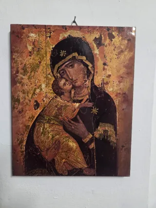 Icone religiose raffigurante la Madonna con il Bambino Gesù. Due pezzi d'arte sacra con dettagli dorati e un'aura antica. Dipinti su legno - Raffigurazione tradizionale della Madonna. - Dettagli in foglia d'oro. - Stile iconografico bizantino. € 25 la coppia