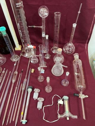 lotto di tanti pezzi vetreria laboratorio ampolle filtro pipette graduate bottiglia grande vetro ambrato tutto come da foto