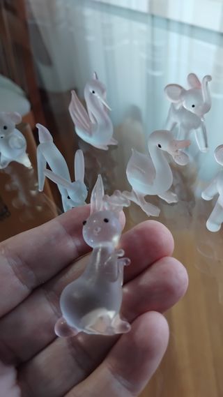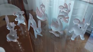 Bellissimo set di 7 miniature di animali in cristallo. Sono trasparenti con sfumature rosa. Perfette per collezionisti o per decorare una mensola. - 7 miniature - Materiale: Cristallo - Colore: Trasparente con sfumature rosa
