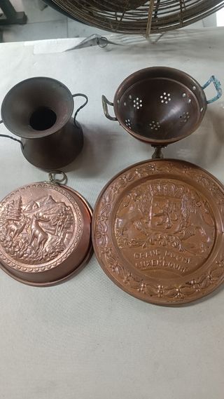Bellissimo set di 4 pezzi in rame, perfetti per un tocco vintage in cucina o come elemento decorativo. Sono in ottime condizioni, mostrano solo lievi segni del tempo. - Colino in rame con manici. - Ciotola in rame con manici. - Stampo da forno in rame con decoro a rilievo. - Piatto decorativo in rame con stemma del Granducato di Lussemburgo.