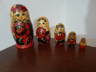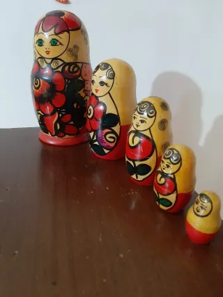 Matrioska originale russa, composta da dieci pezzi realizzati artigianalmente e riccamente decorati a mano su tutti i lati, con sigla dell'autore sul fondo. Lieve graffio su una bambolina (vedi ultima foto). Oggetto da collezione.