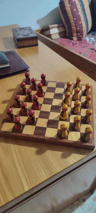 Scacchiera artigianale di produzione russa, con pezzi in legno dipinti a mano. Dimensioni 32cm. Alcune lievi screpolature su alcuni pezzi. - Pezzi rossi e gialli. - Design unico e colorato. - Materiale: legno.