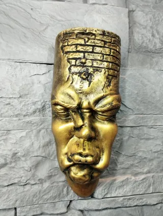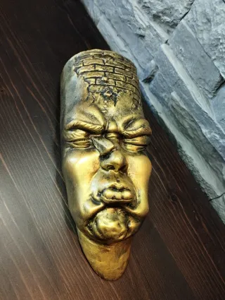 Realizzato e pitturato a mano. Pezzi unici Misure descritte in foto. Materiale Gesso Alabastrino Colore oro / dorato sfumatura nero finitura effetto pietra Elegante e particolare ornamento da parete, gancio sul retro per appendere al muro. Decorazione murale casa design moderno minimalista ispirato alle opere di Johnson Tsang. Particolare statua volto umano stilizzato face pop art "teste di carattere" Franz Xaver Messerschmidt Arredamento casa scultura maschera astratta appendibile Complemento di arredo home arte minimal chic nordic contemporaneo Soprammobile casa statua nordico opera surreale volto umano grottesco espressione