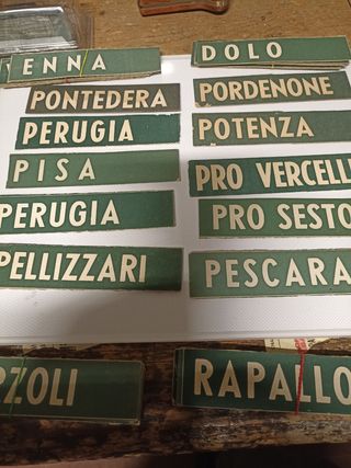 targhette in cartoncino di squadre calcio anni 50. misure 12,5*3 cm . venivano inserite in un tabellone del totip . prezzo cadauno . disponibili una 50ina