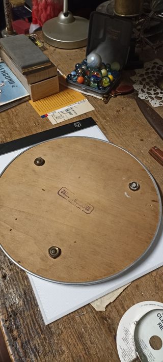 vassoio a specchio con cornice alluminio e fondo in legno . anni 50. diametro cm 28.
