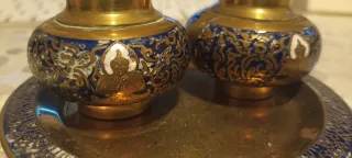Elegante set vintage di porta pepe e sale, di origine thailandese. - Realizzato in metallo dorato. - Decorazioni in smalto blu e oro. - Include vassoio coordinato.