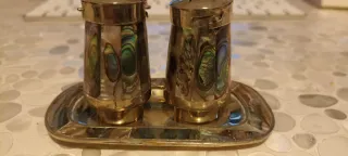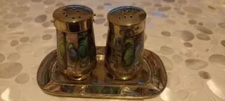 Elegante set porta sale e pepe con finiture in madreperla. - Design raffinato. - Materiali di qualità. - Ideale come centrotavola.