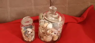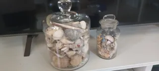 Set di due contenitori in vetro riempiti con conchiglie. - Un contenitore più grande con coperchio a cupola. - Un contenitore più piccolo con tappo. - Decorazione con conchiglie miste.