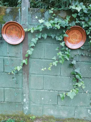 Due piatti decorativi in ceramica con design unici, argilla smaltata. Colore terracotta. Design artigianali. Ideali per appendere alla parete.