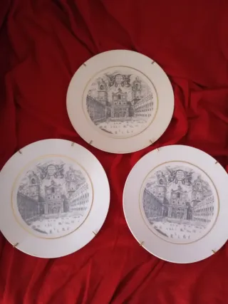 Set di tre piatti decorativi in porcellana Bidasoa. - Design con incisione architettonica. - Bordo dorato. - Con fili per appendere