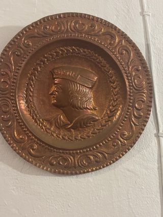 Coppia di piatti decorativi in rame cesellato, con rilievi che rappresentano i Re Cattolici (Isabella I di Castiglia e Ferdinando II d'Aragona). Pezzi in stile storico, molto decorativi, ideali da appendere al muro. Lavoro in rilievo con bei dettagli e patina naturale del rame. Decorazione classica molto usata in case antiche e stile rustico. ✔️ Materiale: rame ✔️ Tecnica: cesellatura ✔️ Epoca: vintage (metà del XX secolo) ✔️ Uso: decorazione murale ✔️ Stato: buono stato generale, 45 a unità‼️ Si vendono insieme o separatamente. Ideali per gli amanti della storia, la decorazione classica o i collezionisti di rame.