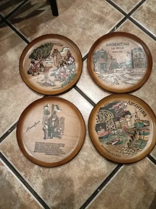 Set di quattro piatti decorativi in pelle incisi con motivi argentini. Ideali per appendere e decorare. Materiale: Pelle incisa. Diametro: 22 cm. Design: Motivi argentini. Uso: Decorazione da appendere.