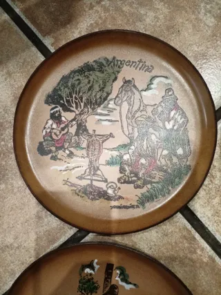 Coppia di piatti antichi in ceramica dipinti a mano, con scene decorative. Sono piatti con molti anni, tipici di case antiche, e si nota il passaggio del tempo nello smalto e nel disegno, che conferisce loro un fascino speciale e autentico. Non sono piatti moderni, ma pezzi decorativi antichi, ideali per appendere alla parete o posizionare su una libreria. Prezzo negoziabile.