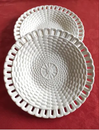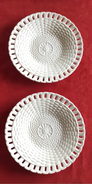 2 antichi piatti in ceramica inglese, marchio Copeland late Spode. Uno è un piatto dolce e l'altro è la base di una salsiera, con incavo particolare. Entrambi 18cm Oggi sono belli anche come portagioielli! Il disegno ripropone il decoro Filigree che apparteneva alla manifattura di Spode, ereditata da Copeland, ed era del 1820: si tratta di un disegno che ebbe molto successo nel XIX secolo e si continuò a produrre su richiesta. vedete lo stato dalle foto, dietro a uno c'è una piccola sbeccatura non visibile davanti Mentre sull'altro c'è una macchia di cottura al centro del disegno. Sono comunque integri senza crepe e ancora molto bel