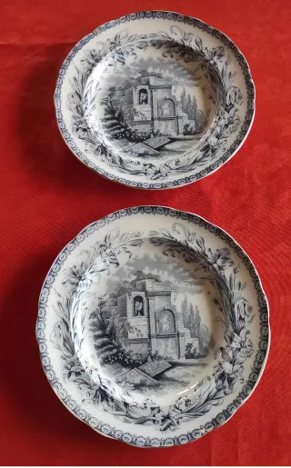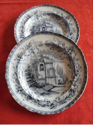 2 bei piatti antichi inglesi di Copeland della serie Ionian, che era dedicata a celebri monumenti antichi della Grecia classica. Qui l'ispirazione è il monumento di Filopappo di Atene. Il bel transferware in grigio-blu presenta un decoro di gigli sul bordo e il paesaggio centrale molto elegante e dettagliato. Diametro 21cm Le condizioni sono veramente eccellenti, ovviamente non ci sono rotture né sbeccature, ma anche lo smalto è veramente lucido, come potete vedere nelle foto controluce. Dal marchio sappiamo che è stato prodotto nel 1851.