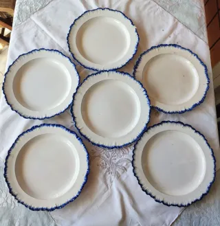 6 piatti di antiquariato in creamware inglese marchio Wedgwood, prodotti fra 1780 e 1790. È il famoso modello "Feather edge" con il bordo decorato come le penne di un uccello e dipinto a mano in smalto blu. Risalgono al periodo in cui la manifattura era ancora diretta da Josiah Wedgwood Le condizioni sono molto buone: non hanno danni seri, principalmente hanno minuscole sbeccature su alcuni punti del bordo, uno solo ha una sbeccatura più grande (Foto 9) Ma sono oggetti che hanno più o meno 240 anni, è normale che ci sia qualche segno del tempo. Diametro 24
