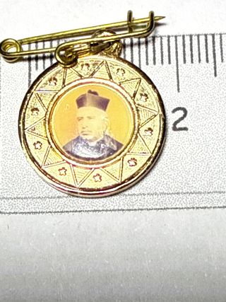 Medaglia con effigie di Servo di Dio Don V. Grossi. Ex indumemtis - Materiale: Metallo dorato - Diametro: circa 2 cm - Completa di cordino rosso