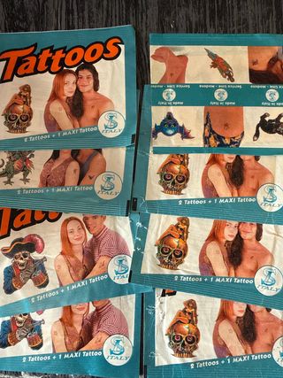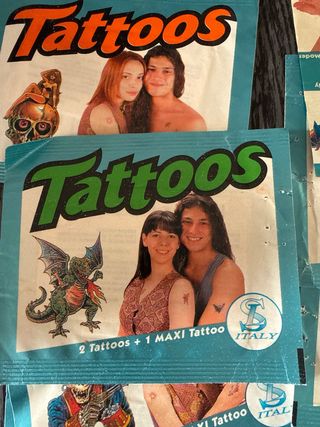 Lotto di 8 bustine di tatuaggi temporanei, originali degli anni '90. - Ogni bustina contiene 2 tatuaggi + 1 maxi tatuaggio. - Made in Italy.