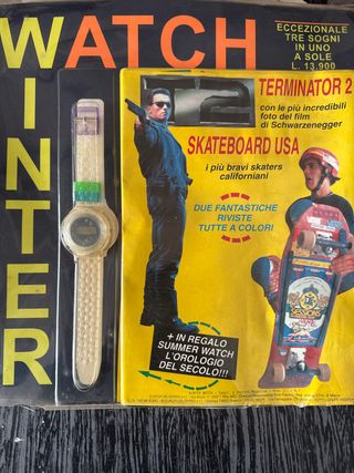 Set composto da un orologio Winter Watch e una rivista Terminator 2. - Orologio Summer Watch in regalo. - Rivista Skateboard USA inclusa. - Foto del film Terminator 2 con Schwarzenegger. - Due riviste a colori.