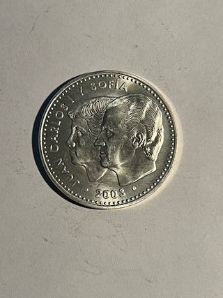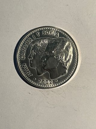 Moneta commemorativa spagnola del 2002. - Dritto: Ritratto di Juan Carlos I e Sofia. - Rovescio: Stemma della Spagna. - Anno: 2002.