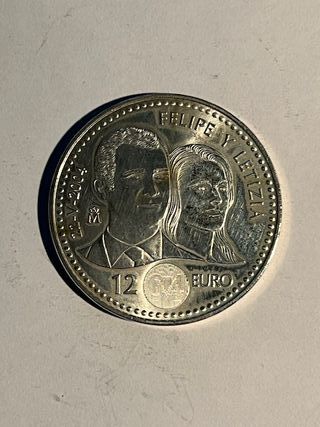 Moneta commemorativa spagnola da 12 Euro del 2004. - Raffigura i profili di Felipe e Letizia. - Anno di conio: 2004. - Valore nominale: 12 Euro.