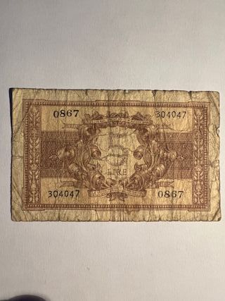 Biglietto di stato da 5 Lire. - Numeri di serie: 304047 e 0867. - Design con elementi decorativi e cornice.