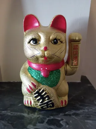 Gatto portafortuna in ceramica dorata, un classico simbolo di buona sorte. - Finitura lucida dorata. - Dettagli in rosso e verde glitter. - Caratterizzato da simboli orientali.(Manca il coperchio per le batterie)