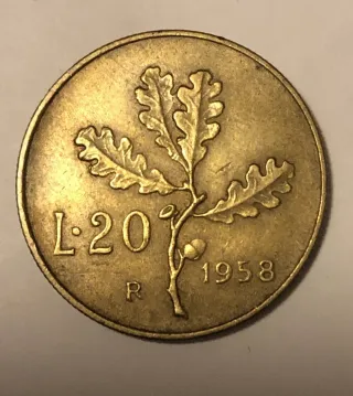 Moneta da 20 Lire italiane del 1958, raffigurante una quercia con ghiande. - Dritto: L.20 e R (zecca di Roma). - Rovescio: Rami di quercia con ghiande e anno 1958. - Materiale: Bronzital.
